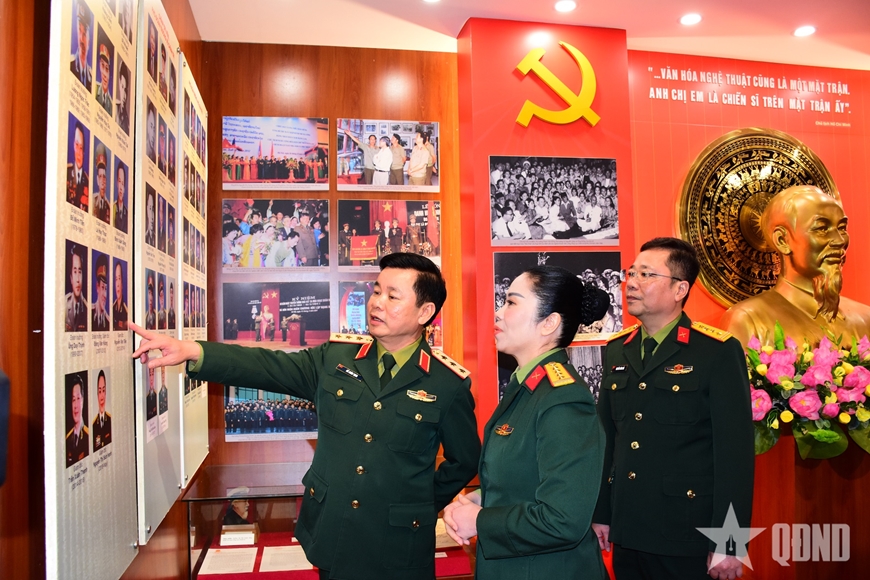 | Thượng tướng Đỗ Xuân Tụng tham quan Phòng truyền thống Nhà hát Ca múa nhạc Quân đội. |