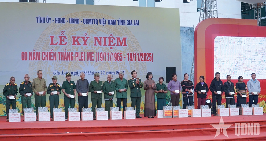 Trước đó, Thượng tướng Lê Đức Thái dự Lễ kỷ niệm 60 năm Chiến thắng Plei Me và trao quà tặng các gia đình chính sách.