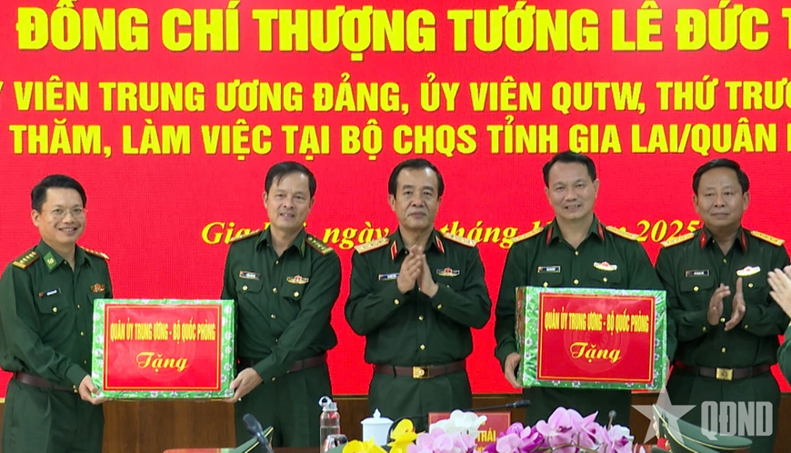 Nhân dịp này, Thượng tướng Lê Đức Thái trao quà tặng Bộ CHQS tỉnh Gia Lai và Ban chỉ huy Bộ đội Biên phòng tỉnh Gia Lai.