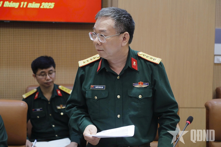 | Đại tá Nguyễn Phúc Linh, Viện trưởng Viện Vũ khí trình bày báo cáo tại hội nghị. |