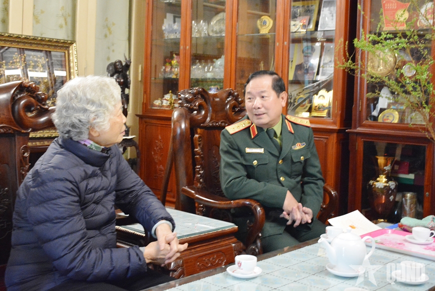 | Thượng tướng Lê Huy Vịnh trò chuyện với thân nhân gia đình Trung tướng Trần Hanh. |