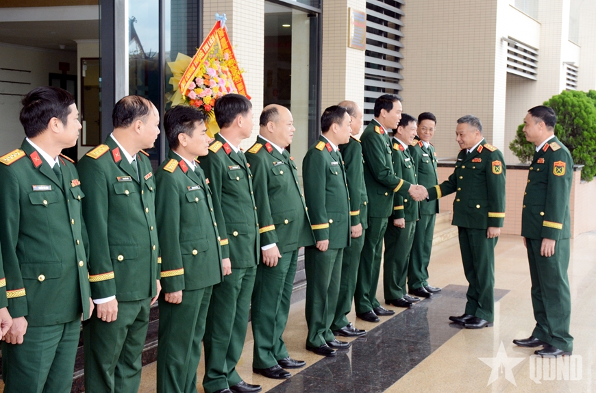 Các đồng chí trong Đảng ủy, Ban giám hiệu Trường Sĩ quan Chính trị đón Thượng tướng Lê Quang Minh và đoàn công tác đến thăm, chúc mừng.