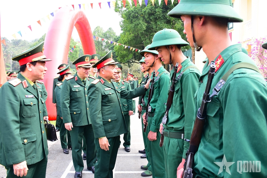 | Thượng tướng Lê Quang Minh thăm hỏi, động viên cán bộ, chiến sĩ. |