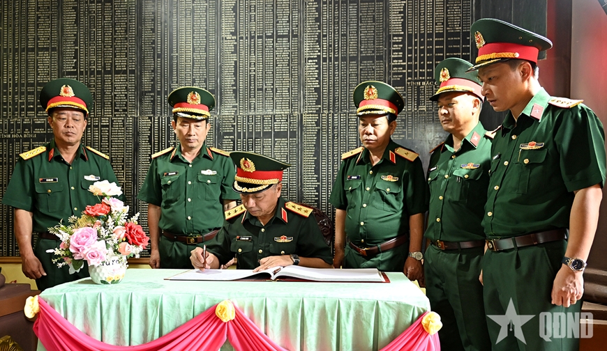 Thượng tướng Lê Quang Minh, Phó chủ nhiệm Tổng cục Chính trị QĐND Việt Nam ghi sổ cảm tưởng tại Nhà tưởng niệm các Anh hùng, liệt sĩ Sư đoàn 320. |