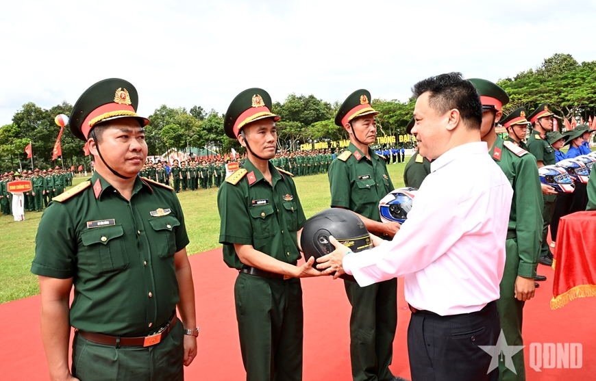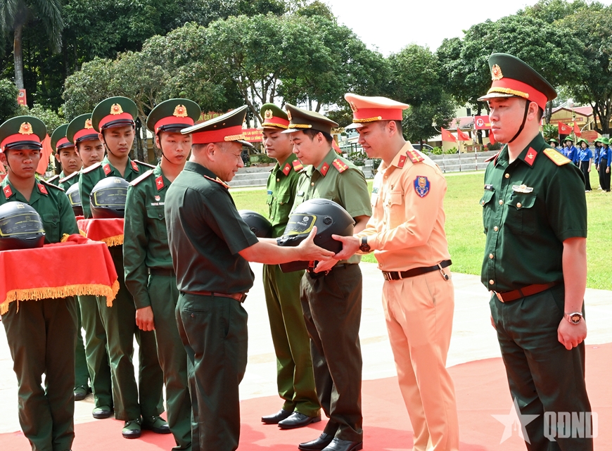 Thượng tướng Lê Quang Minh trao mũ bảo hiểm tặng các lực lượng tham gia Ngày hội. |