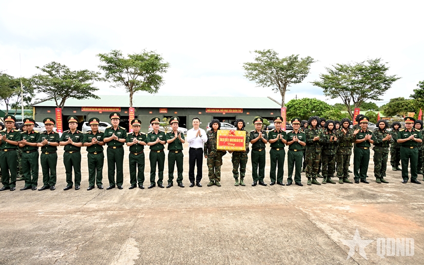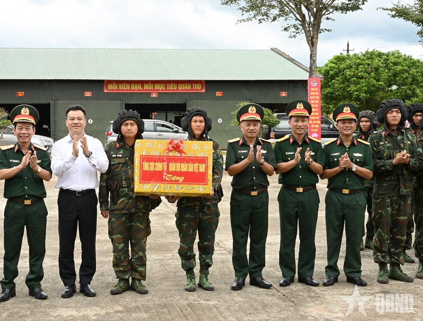 Thượng tướng Lê Quang Minh trao quà tặng cán bộ, chiến sĩ Trung đoàn Bộ binh cơ giới 48. |