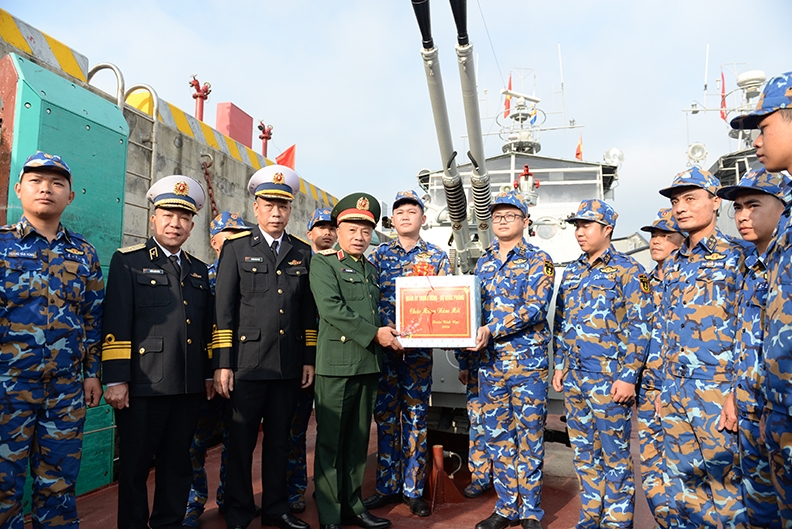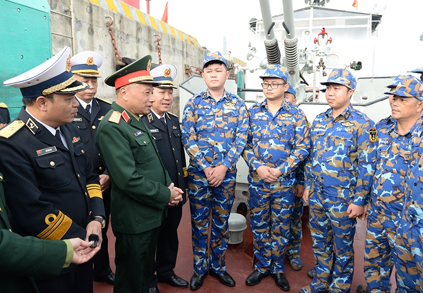Thượng tướng Lê Quang Minh thăm, động viên cán bộ, chiến sĩ Lữ đoàn 169, Bộ tư lệnh Vùng 1 Hải quân đang thực hiện nhiệm vụ trực chiến trên tàu.