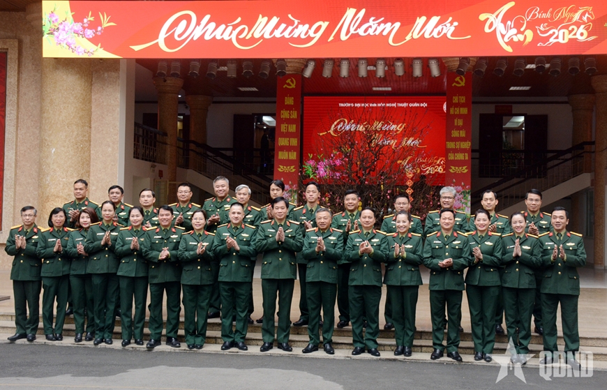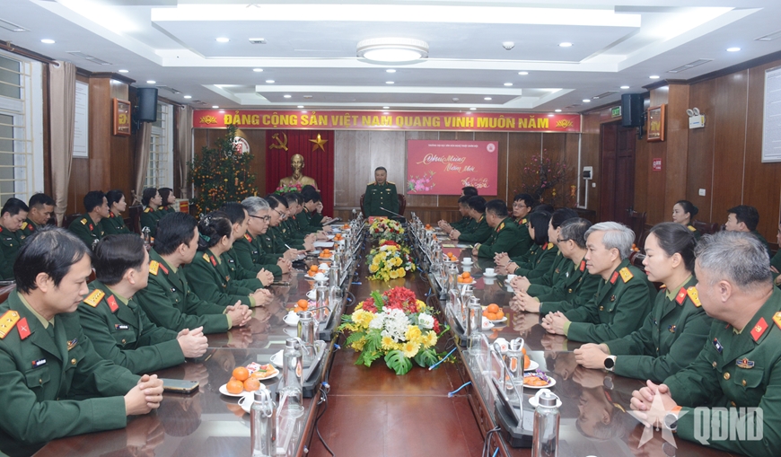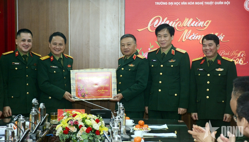 | Lãnh đạo, chỉ huy Trường Đại học Văn hóa Nghệ thuật Quân đội đón Thượng tướng Lê Quang Minh và đoàn công tác đến thăm, chúc Tết. |