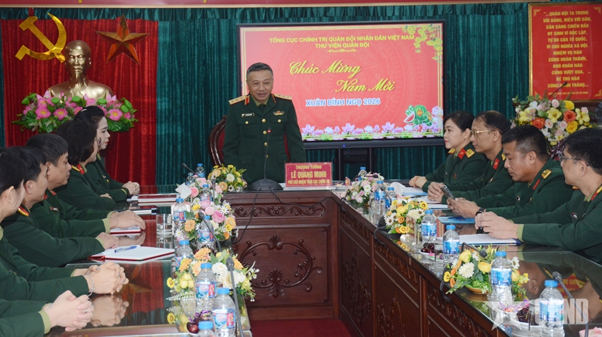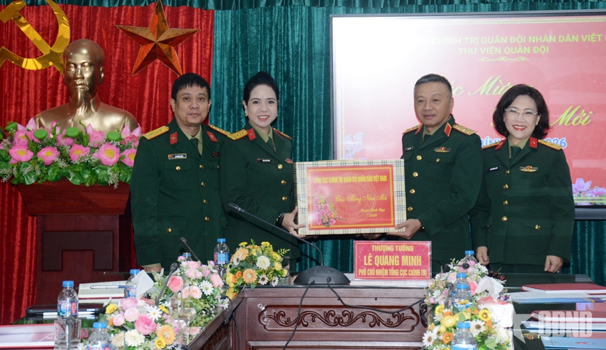 | Thượng tướng Lê Quang Minh trao quà của Tổng cục Chính trị và gửi tới cán bộ, nhân viên, chiến sĩ, người lao động Thư viện Quân đội lời chúc mừng năm mới hạnh phúc, thành công, an khang, thịnh vượng. |