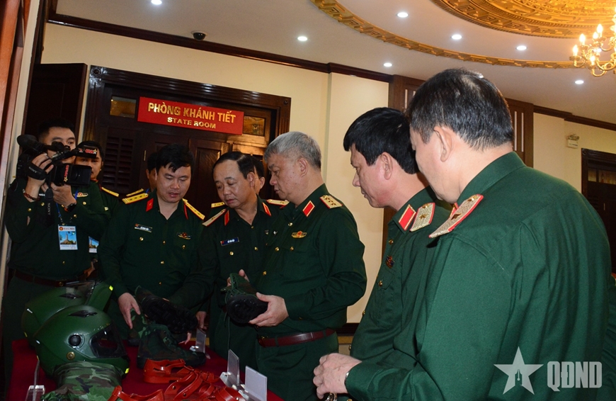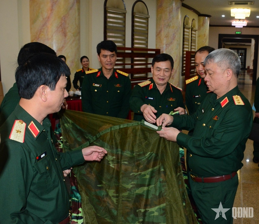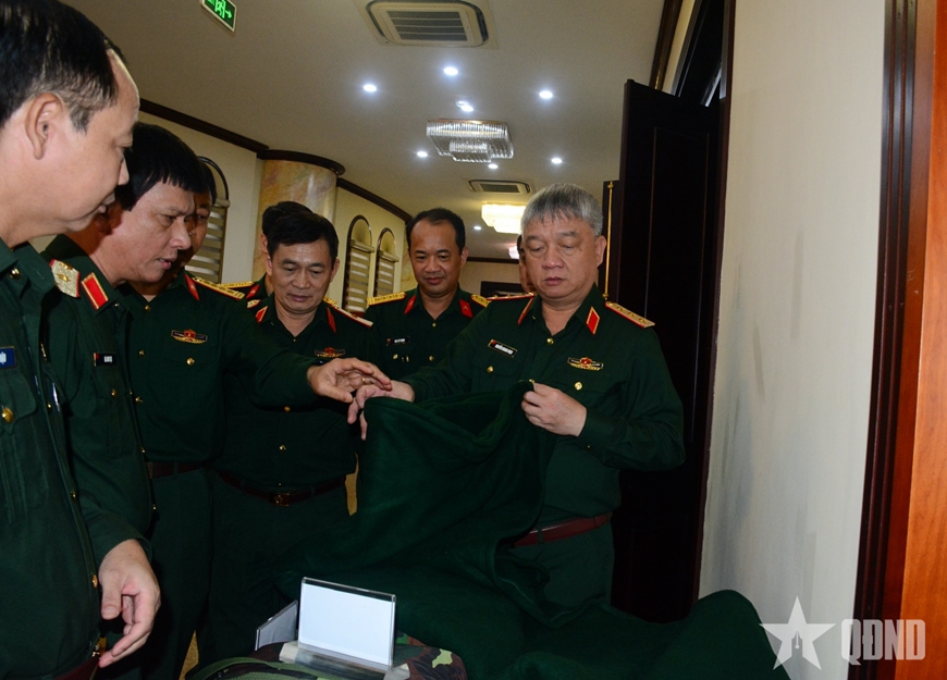 | Thượng tướng Nguyễn Quang Ngọc và các đại biểu kiểm tra một số mẫu quân trang đang được nghiên cứu, thử nghiệm. |