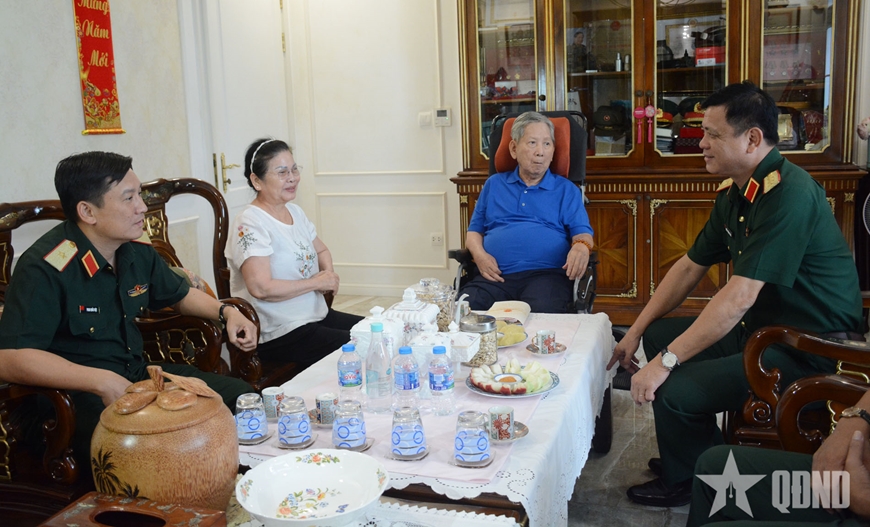 | Thượng tướng Nguyễn Trường Thắng thăm hỏi sức khỏe Thượng tướng Phan Trung Kiên và gia đình. |