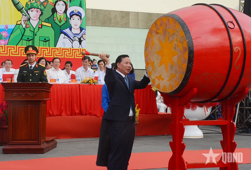 | Đồng chí Nguyễn Văn Út đánh trống khai hội tòng quân. |