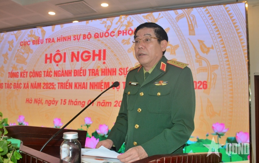 Thượng tướng Nguyễn Văn Gấu phát biểu tại Hội nghị tổng kết công tác ngành Điều tra hình sự Quân đội và công tác đặc xá năm 2025, triển khai nhiệm vụ trọng tâm năm 2026 của Cục Điều tra hình sự Bộ Quốc phòng.