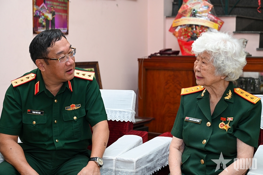 | Thượng tướng Phạm Hoài Nam thăm, chúc Tết Anh hùng Lực lượng vũ trang nhân dân, Thượng úy Nguyễn Thị Mỹ Nhung. |