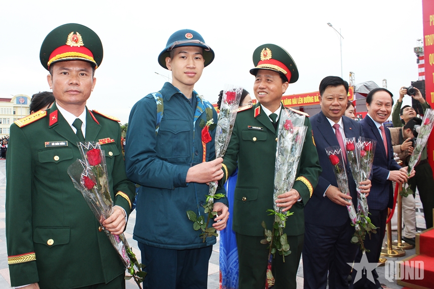 | Lãnh đạo Quân khu 3 và Bộ CHQS TP Hải Phòng động viên thanh niên nhập ngũ. |
