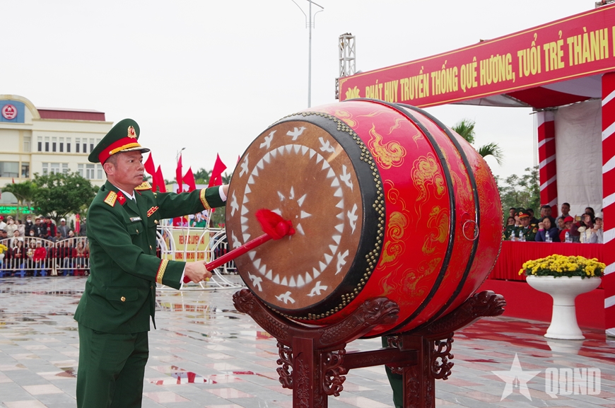 | Đại tá Bùi Xuân Thắng, Chỉ huy trưởng Bộ CHQS TP Hải Phòng đánh trống hội tòng quân. |