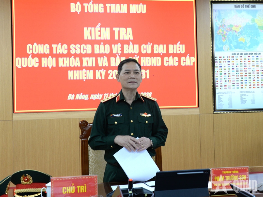 Để hoàn thành tốt nhiệm vụ SSCĐ bảo vệ cuộc bầu cử, không để bị động, bất ngờ trong mọi tình huống, Thượng tướng Phạm Trường Sơn yêu cầu Đảng ủy, Bộ CHQS TP Đà Nẵng tiếp tục quán triệt, triển khai thực hiện nghiêm các chỉ thị, kế hoạch và văn bản chỉ đạo, hướng dẫn của trên về công tác SSCĐ bảo vệ cuộc bầu cử, tăng cường công tác kiểm tra, giám sát của cán bộ các cấp, chú ý công tác tuần tra, kiểm soát quân sự, canh gác bảo đảm an toàn tuyệt đối cơ quan, đơn vị. Rà soát, điều chỉnh, bổ sung kịp thời các nội dung của kế hoạch SSCĐ bảo vệ cuộc bầu cử sát với tình hình thực tiễn, nhất là những nội dung mới phát sinh; phối hợp, triển khai các biện pháp hiệu quả phòng, chống tác chiến tàu bay không người lái (UAV) và các phương tiện bay khác, bảo đảm an toàn tuyệt đối cuộc bầu cử. Triển khai đồng bộ các biện pháp quản lý, bảo vệ biên giới, biển, đảo; tăng cường kiểm soát, kịp thời phát hiện, ngăn chặn các hoạt động xâm nhập trái phép qua biên giới.