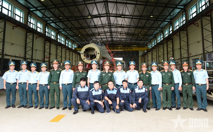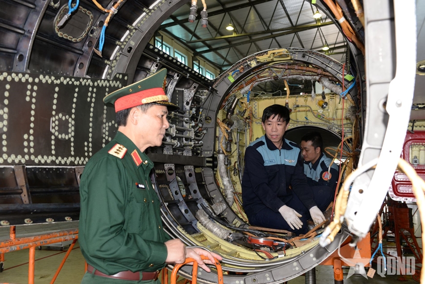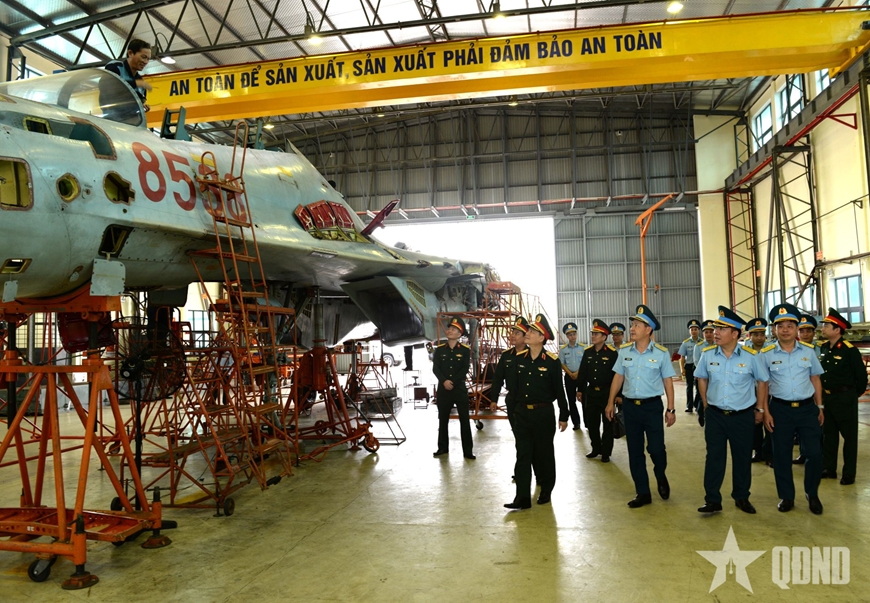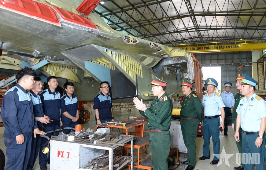 | Thượng tướng Phạm Trường Sơn kiểm tra công tác sửa chữa lớn, tăng tổng niên hạn sử dụng máy bay Su-27UBK tại Phân xưởng 1. |