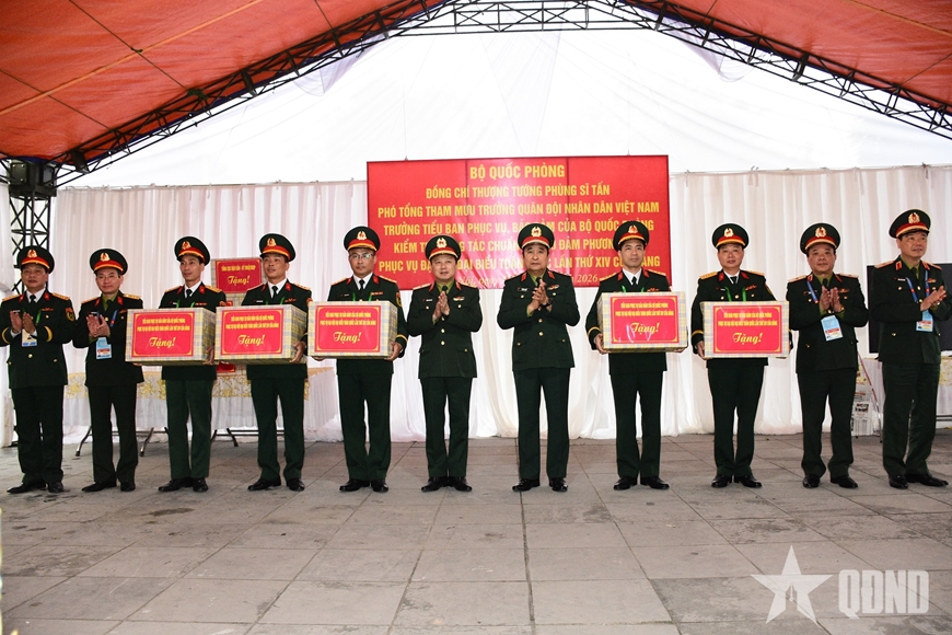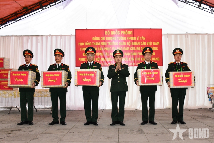 | Thượng tướng Phùng Sĩ Tấn và đại diện các cơ quan chức năng tặng quà động viên lực lượng tham gia bảo đảm vận chuyển, đưa đón đại biểu dự Đại hội. |