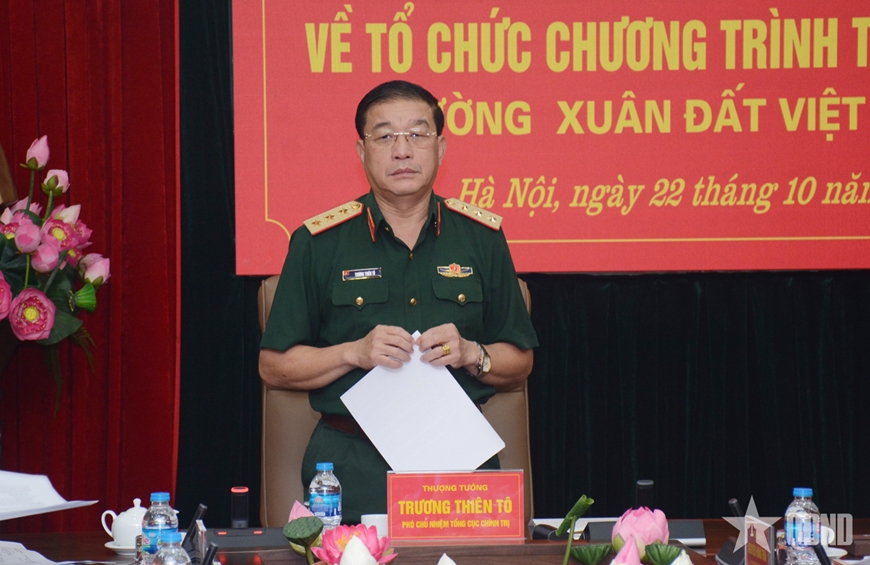 Bên cạnh các nội dung trên, Thượng tướng Trương Thiên Tô yêu cầu Trung tâm Phát thanh - Truyền hình Quân đội phối hợp với các cơ quan, đơn vị liên quan nhanh chóng hoàn thành kế hoạch, kịch bản chi tiết để báo cáo các cấp xem xét theo quy định; tiến hành đồng thời công tác chuẩn bị về mọi mặt. Đồng thời, tiếp tục khảo sát, nghiên cứu, lựa chọn địa điểm tổ chức chương trình phù hợp; phối hợp, hiệp đồng chặt chẽ với các cơ quan, đơn vị liên quan bảo đảm tốt an ninh, trật tự, âm thanh, ánh sáng để chương trình thành công tốt đẹp, an toàn tuyệt đối về mọi mặt.