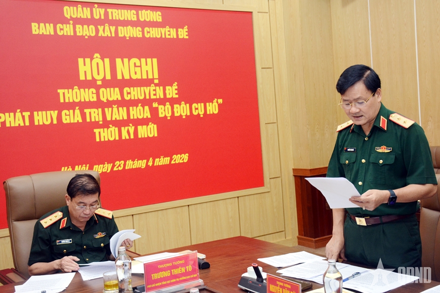 Tại hội nghị, đại diện Cục Tuyên huấn (Tổng cục Chính trị) báo cáo tóm tắt kết quả nghiên cứu, xây dựng chuyên đề; đề xuất một số nội dung nhằm bảo đảm tốt tiến độ, chất lượng, sớm đưa chuyên đề vào triển khai, phát huy giá trị trong thực tiễn. Theo đó, căn cứ Chương trình hành động số 04-Ctr/QUTW ngày 2-10-2025 của Quân ủy Trung ương về thực hiện Nghị quyết Đại hội đại biểu Đảng bộ Quân đội lần thứ XII, nhiệm kỳ 2025-2030, Cục Tuyên huấn đã tham mưu với Quân ủy Trung ương ban hành Kế hoạch số 330 về xây dựng, triển khai chuyên đề "Phát huy giá trị văn hóa "Bộ đội Cụ Hồ" thời kỳ mới".