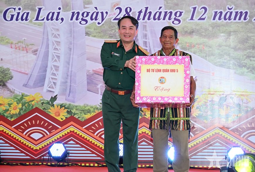 | Lãnh đạo Quân khu 5 trao quà tặng thôn Moóc Đen 1, xã Ia Dom. |
