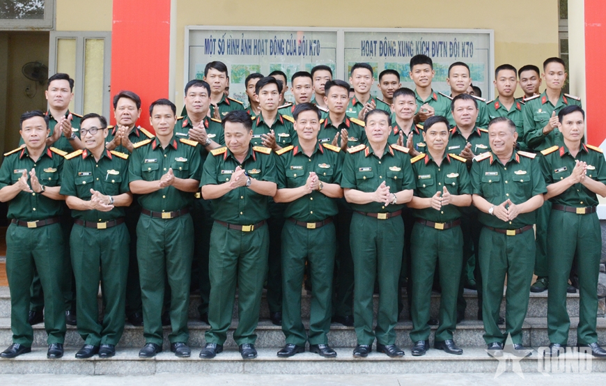 | Thượng tướng Trương Thiên Tô chụp ảnh với cán bộ, chiến sĩ Đội K70. |