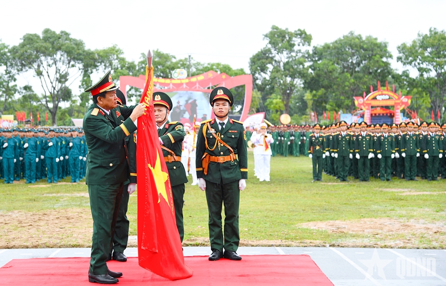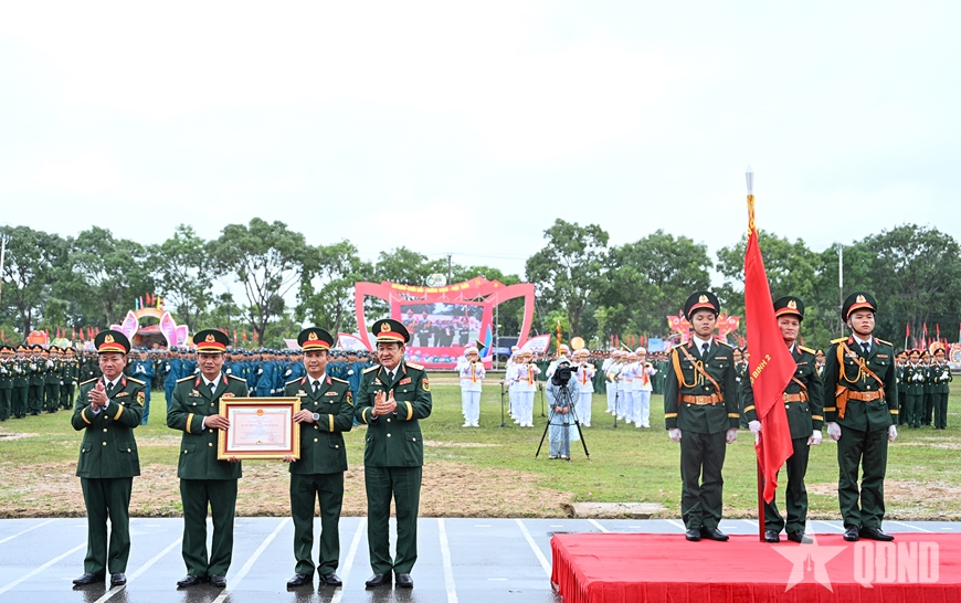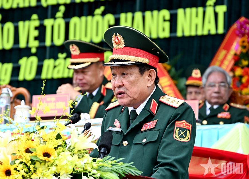 Thừa ủy quyền của Chủ tịch nước, Thượng tướng Võ Minh Lương trao Huân chương Bảo vệ Tổ quốc hạng Nhất cho Sư đoàn 2. |
