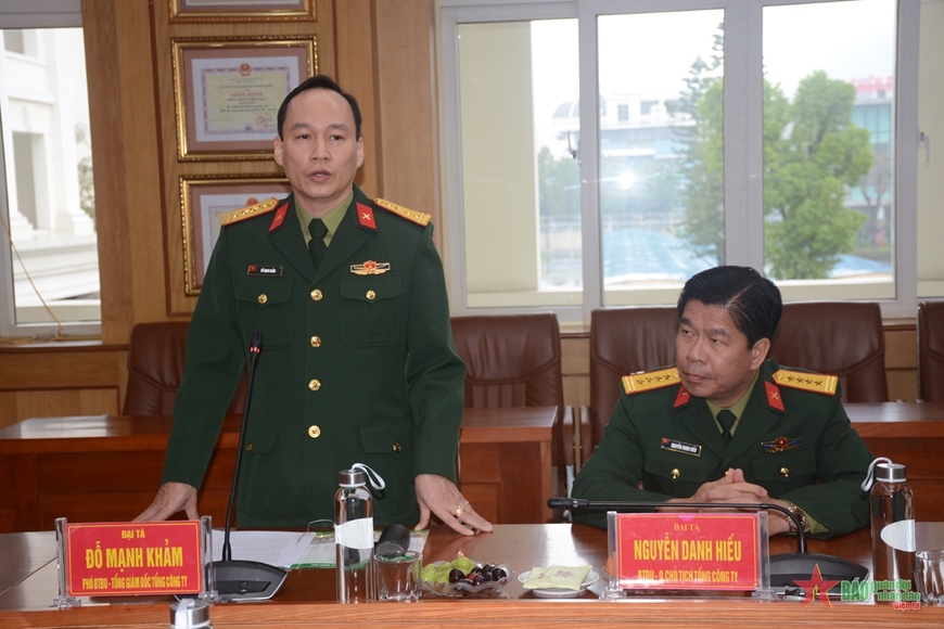| Lãnh đạo Công ty Đông Bắc báo cáo khái quát với đoàn công tác Bộ Quốc phòng kết quả sản xuất kinh doanh của Công ty năm 2022. Ảnh: KIM NGỌC |