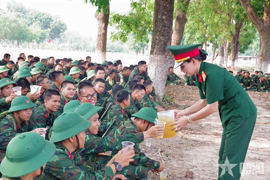 Ngay sau khi tiếp nhận chiến sĩ mới, đơn vị đã phối hợp với cấp ủy, chính quyền và các tổ chức đoàn thể địa phương triển khai nhiều hoạt động đồng hành. Các cán bộ phụ nữ, đoàn viên, thanh niên Sư đoàn 5 và đơn vị kết nghĩa trực tiếp đến thăm, động viên, tặng quà gồm nhu yếu phẩm, vật dụng sinh hoạt và sách báo phục vụ đời sống tinh thần. Nổi bật là hoạt động tiếp nước uống, trái cây, nước mát ngay trên thao trường trong những ngày huấn luyện cường độ cao, thời tiết nắng nóng. Những bình nước mát, nước chanh, trà giải nhiệt cùng các phần trái cây tươi được chuẩn bị chu đáo, kịp thời phục vụ bộ đội giữa giờ nghỉ, giúp chiến sĩ nhanh chóng hồi phục thể lực, bảo đảm sức khỏe để tiếp tục luyện tập.