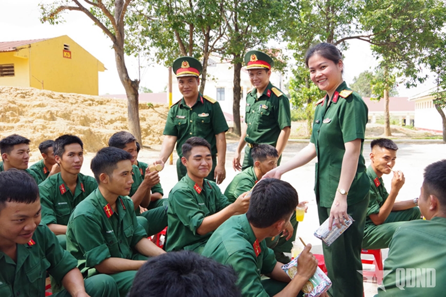 | Tặng nước cam cho chiến sĩ trong giờ nghỉ giải lao trên bãi tập. |