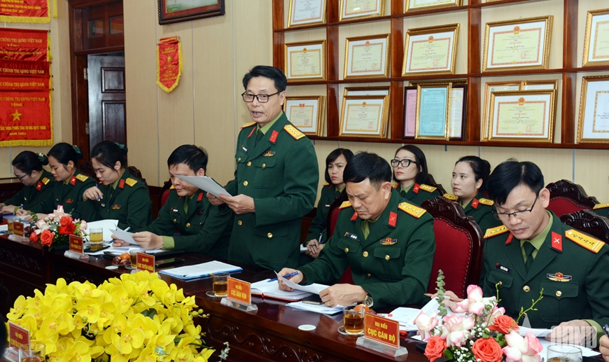 | Đại biểu Cục Tuyên huấn (Tổng cục Chính trị) phát biểu đóng góp nhiều ý kiến tâm huyết tại hội nghị. |