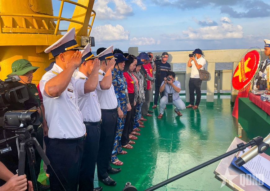 Từ sáng sớm, công tác tổ chức lễ tưởng niệm được đoàn công tác và cán bộ, chiến sĩ tàu Trường Sa 19 chuẩn bị chu đáo, trang trọng. Trên boong tàu, cán bộ, chiến sĩ và các đại biểu trong trang phục chỉnh tề, xếp hàng ngay ngắn trước vòng hoa hình lá cờ Tổ quốc, với dải băng mang dòng chữ “Đời đời nhớ ơn các Anh hùng liệt sĩ”.