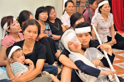 | Nhiều người đến viếng đã không cầm nổi nước mắt khi thấy người vợ trẻ và đứa con nhỏ mới 6 tuổi đầu trắng khăn tang của liệt sĩ Ngô Văn Vinh. |