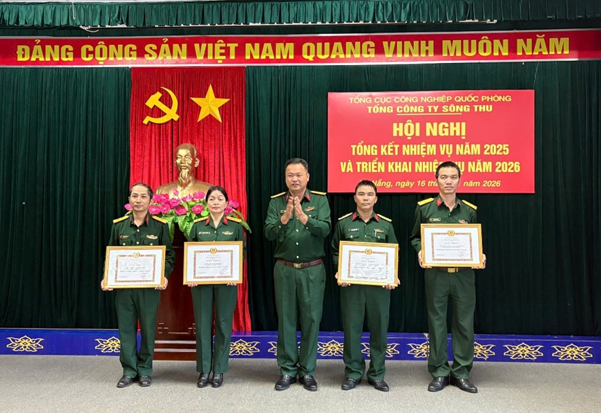 Đại tá Đinh Trường Sơn, Tổng giám đốc Tổng công ty Sông Thu trao thưởng các tập thể đạt thành tích xuất sắc trong thực hiện nhiệm vụ năm 2025.