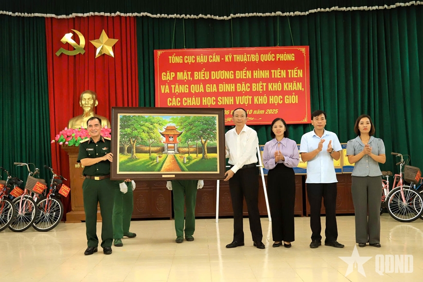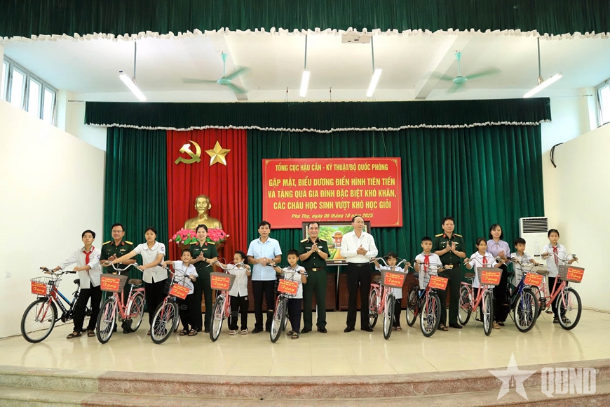 Đoàn công tác Tổng cục Hậu cần - Kỹ thuật và chính quyền địa phương trao xe đạp tặng học sinh vượt khó học giỏi. |