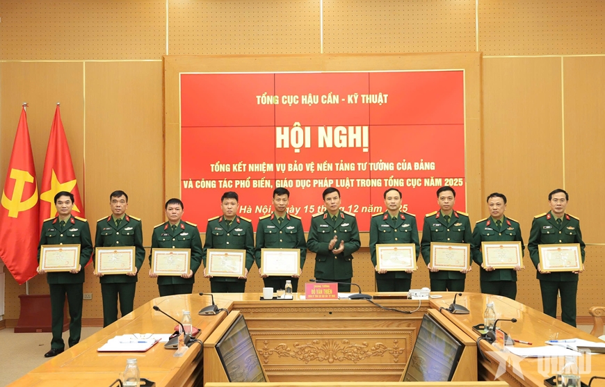 | Trung tướng Đỗ Văn Thiện trao khen thưởng tặng các tập thể, cá nhân đã có thành tích xuất sắc trong công tác bảo vệ nền tảng tư tưởng của Đảng năm 2025. |