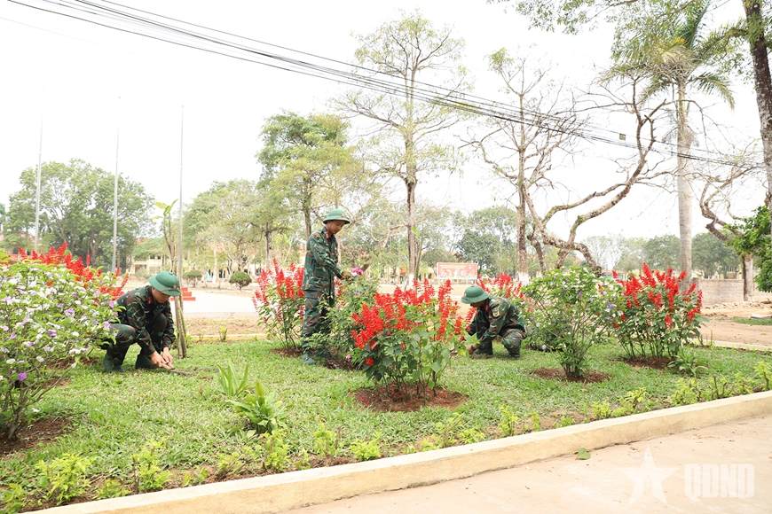 Chiến sĩ Trung đoàn 43 chăm sóc bồn hoa, cây cảnh trong khuôn viên đơn vị.