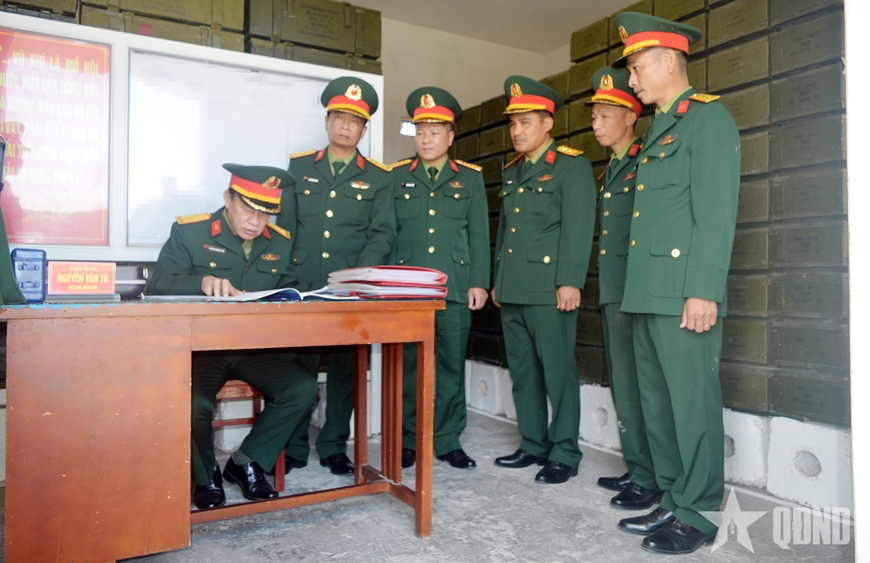 | Đoàn tiến hành kiểm tra việc đăng ký, thống kê, mẫu biểu quản lý vũ khí, khí tài, đạn dược của Trung đoàn 2. |
