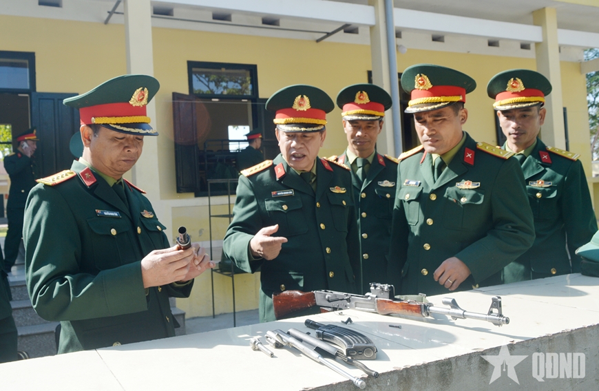 | Đoàn tiến hành kiểm tra việc bảo quản vũ khí, trang bị của bộ đội. |