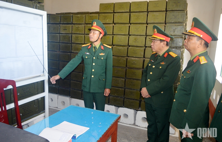 Đoàn tiến hành kiểm tra việc sắp xếp vũ khí, khí tài, đạn dược tại kho đạn.