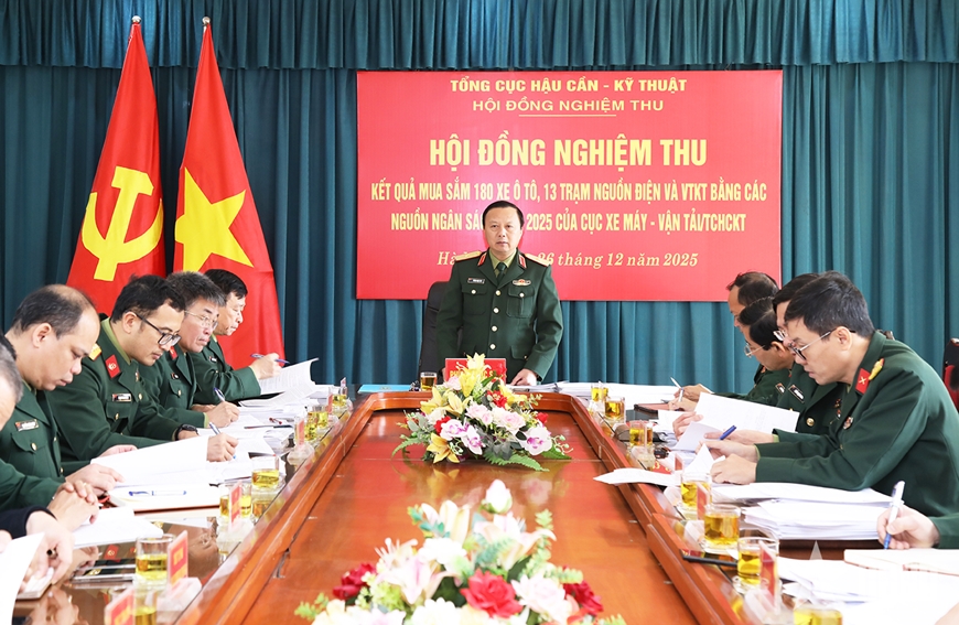 Ngày 26-12, tại Hà Nội, Hội đồng nghiệm thu Tổng cục Hậu cần - Kỹ thuật tổ chức nghiệm thu kết quả mua sắm 180 xe ô tô, 13 trạm nguồn điện và vật tư kỹ thuật được mua sắm bằng các nguồn ngân sách năm 2025 của Cục Xe máy - Vận tải. Thiếu tướng Phùng Ngọc Sơn, Phó chủ nhiệm, Tham mưu trưởng Tổng cục Hậu cần - Kỹ thuật, Chủ tịch Hội đồng nghiệm thu chủ trì phiên họp.