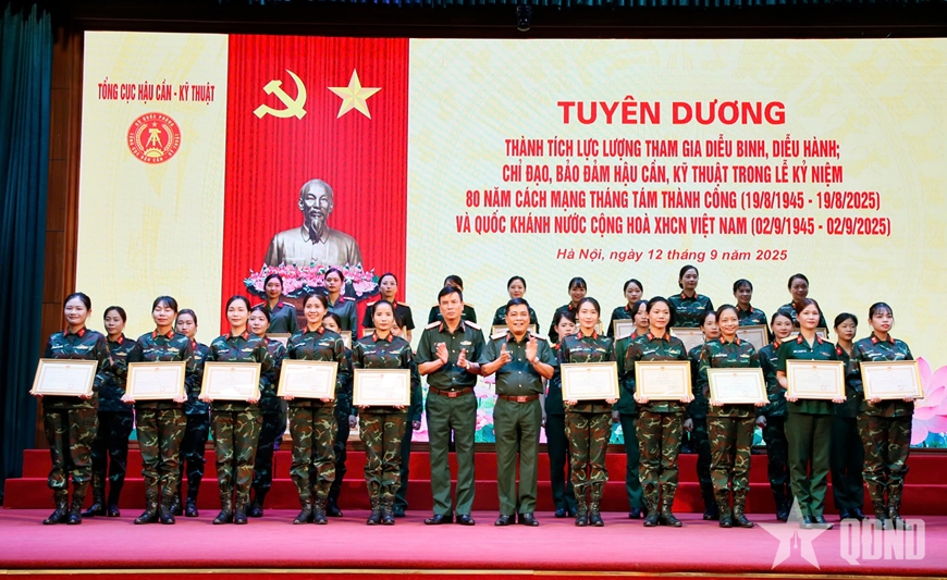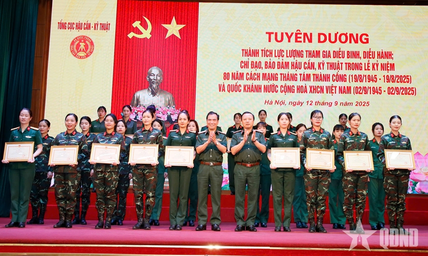| Thủ trưởng Tổng cục Hậu cần - Kỹ thuật trao Bằng khen của Bộ Quốc phòng, Bộ Tổng Tham mưu, Tổng cục Hậu cần - Kỹ thuật tặng các nữ quân nhân trực tiếp tham gia diễu binh, diễu hành. |