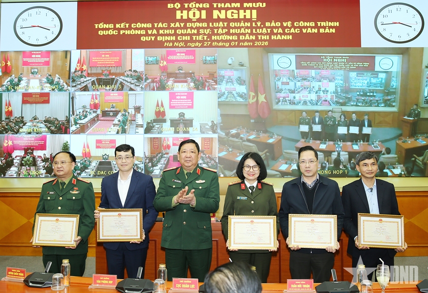 Ban tổ chức tiến hành trao Bằng khen của thủ trưởng Bộ Quốc phòng tặng các tập thể, cá nhân có thành tích xuất sắc trong tham gia xây dựng Luật.
