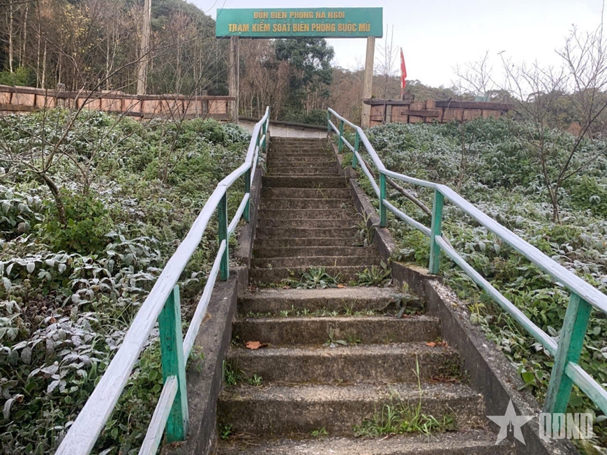 | Thời tiết lạnh giá, phủ sương giá tại Trạm Kiểm soát Biên phòng trên đỉnh Puxailaileng. |