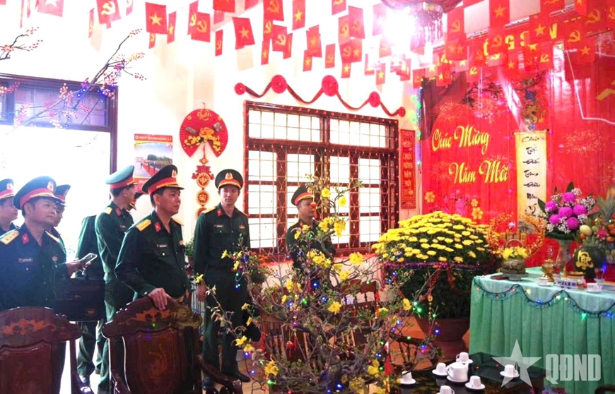 Nổi bật trong không gian trang trí Tết là khu vực bàn thờ Tổ quốc được bài trí trang nghiêm, thành kính. Không gian trang trọng ấy không chỉ làm đẹp thêm doanh trại ngày Xuân mà còn là bài học trực quan sinh động về truyền thống, bồi đắp niềm tự hào, ý thức trách nhiệm cho mỗi cán bộ, chiến sĩ.