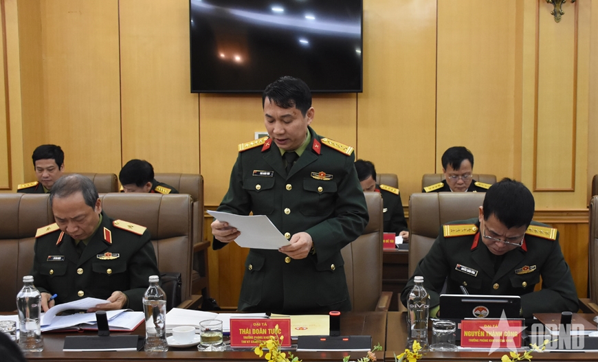 | Đại tá Thái Doãn Tước, Trưởng phòng Khoa học Quân sự, Tổng cục Chính trị trình bày báo cáo tóm tắt kết quả triển khai thực hiện chương trình. |