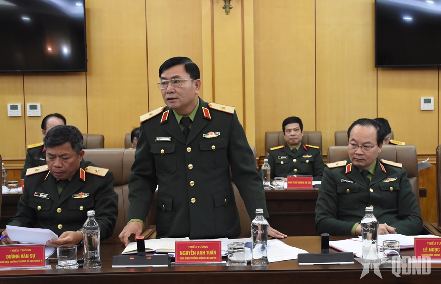 | Thiếu tướng Nguyễn Anh Tuấn, Phó viện trưởng Viện chiến lược và Lịch sử Quốc phòng Việt Nam phát biểu tại hội nghị. |