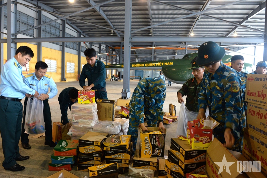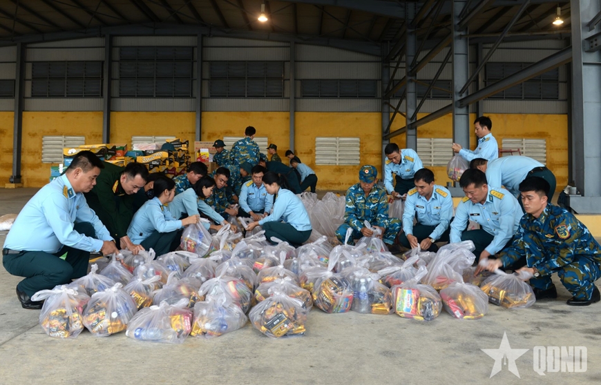 Trung đoàn Không quân 930 tiếp nhận 1.000 suất quà của Quân khu 5, tổ chức đóng gói để vận chuyển đến nhân dân các tỉnh Nam Trung Bộ.