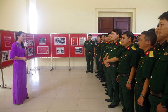 Cán bộ Bảo tàng Xô Viết Nghệ Tĩnh giới thiệu các hình ảnh, tư liệu “Từ Tự vệ đỏ đến lực lượng vũ trang nhân dân Việt Nam” cho cán bộ, chiến sĩ Trung đoàn 335.